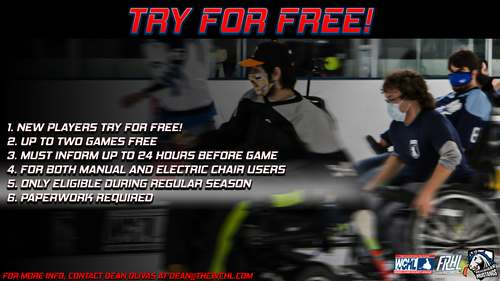 This is your chance, try out wheelchair hockey today and get hooked! If you decide to pursue this opportunity or want more details, please contact Dean Olivas at dean@thewchl.com.
