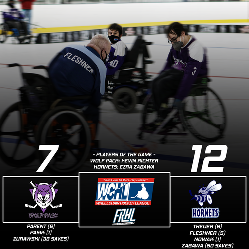 However, the Hornets turned it on in the third period and did not look back scoring 7 goals. Along with the help of some impressive goal tending by Ezra Zabawa making 50 saves and solid defense from Hornets captain Katie Frayer and Ron Woodring. The Hornets managed to get their second victory of the season making their record 2 - 4 - 0. The Wolf Pack drops to 1 - 4 - 1.